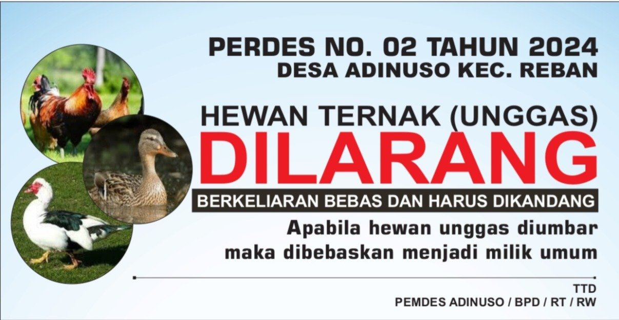 Diberitahukan kepada seluruh warga masyarakat Desa Adinuso, bahwa berdasarkan Peraturan Desa Adinuso Nomor 02 Tahun 2024 tentang Ketertiban Umum dan Ketenteraman Masyarakat, ditegaskan bahwa ternak unggas (seperti ayam, itik, angsa, dan sejenisnya) dilarang berkeliaran atau diumbar di lingkungan desa. Adapun ketentuan penting yang perlu diperhatikan: